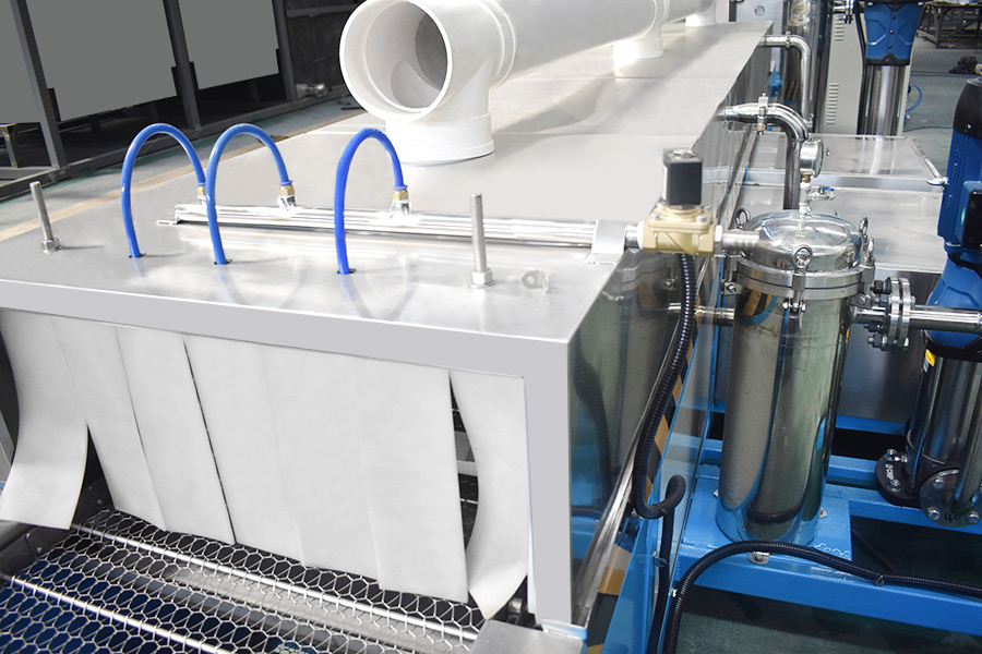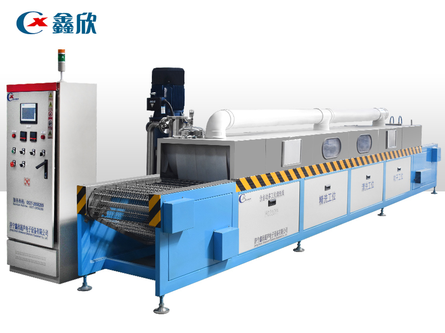 該設(shè)備有上下料網(wǎng)帶、超聲波清洗工位、噴淋漂洗工位、高壓風(fēng)切、熱風(fēng)烘干工位、溫控水加熱系統(tǒng)、風(fēng)機、溫控空氣加熱系統(tǒng)、移動式風(fēng)刀、PLC+觸摸屏控制系統(tǒng)、管路系統(tǒng)及智能電器控制系統(tǒng)等組成。自動進(jìn)排液和自動加溫系統(tǒng)完全實現(xiàn)了無人干預(yù),自動運行,很大程度上降低了工人的勞動強度。先進(jìn)的霧氣處理系統(tǒng)可以將清洗時產(chǎn)生的霧氣冷凝回流,空氣經(jīng)過濾和活性炭吸附后排出。