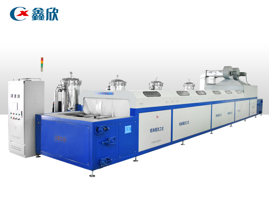 該設(shè)備有上下料網(wǎng)帶、超聲波清洗工位、噴淋漂洗工位、高壓風(fēng)切、熱風(fēng)烘干工位、溫控水加熱系統(tǒng)、風(fēng)機(jī)、溫控空氣加熱系統(tǒng)、移動式風(fēng)刀、PLC+觸摸屏控制系統(tǒng)、管路系統(tǒng)及智能電器控制系統(tǒng)等組成。自動進(jìn)排液和自動加溫系統(tǒng)完全實現(xiàn)了無人干預(yù),自動運行,很大程度上降低了工人的勞動強(qiáng)度。先進(jìn)的霧氣處理系統(tǒng)可以將清洗時產(chǎn)生的霧氣冷凝回流,空氣經(jīng)過濾和活性炭吸附后排出。